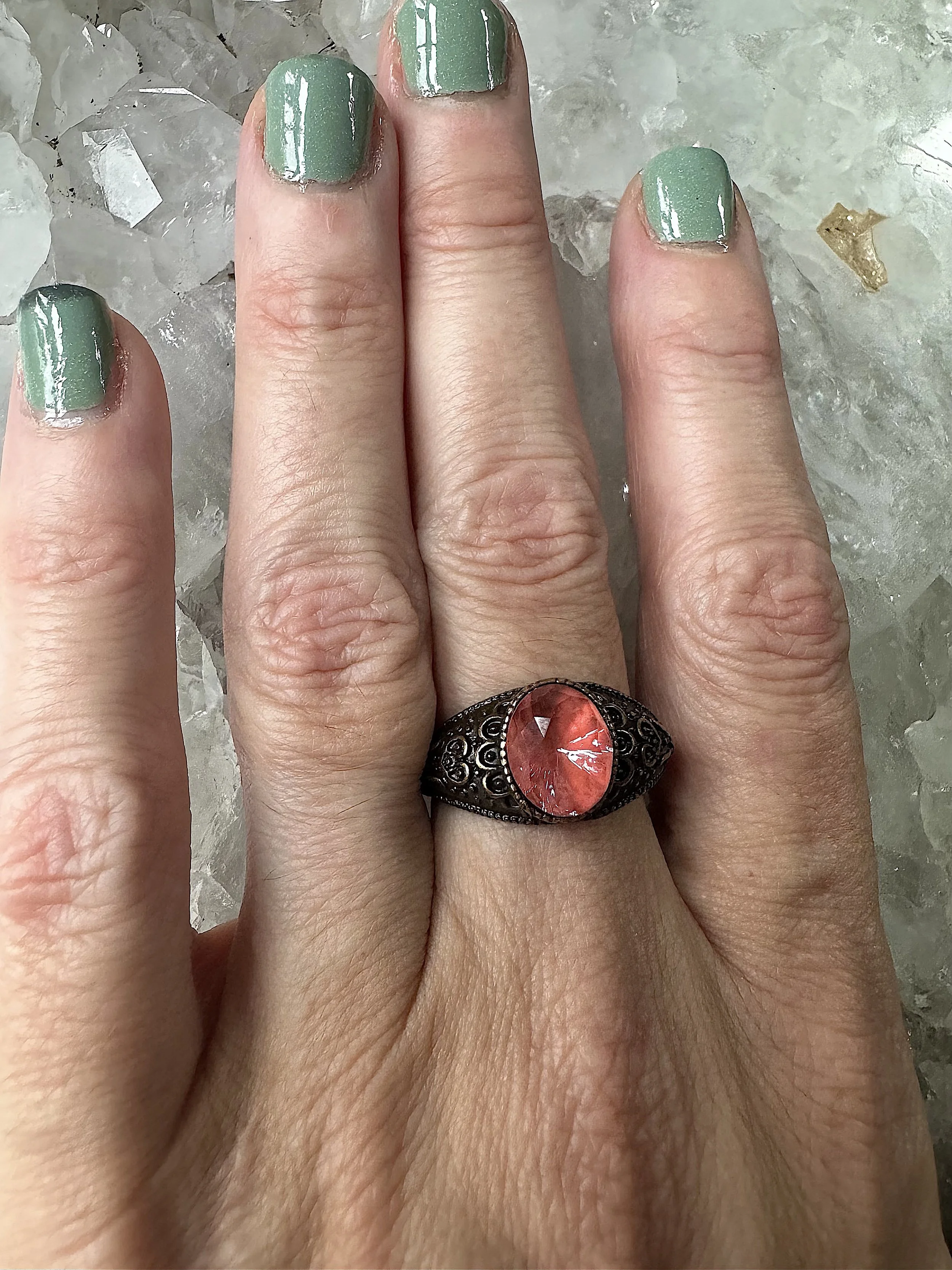 Gorgeous vintage brass stamped base, set with petite Swarovski crystal, adjustable base, fitting all ring sizes