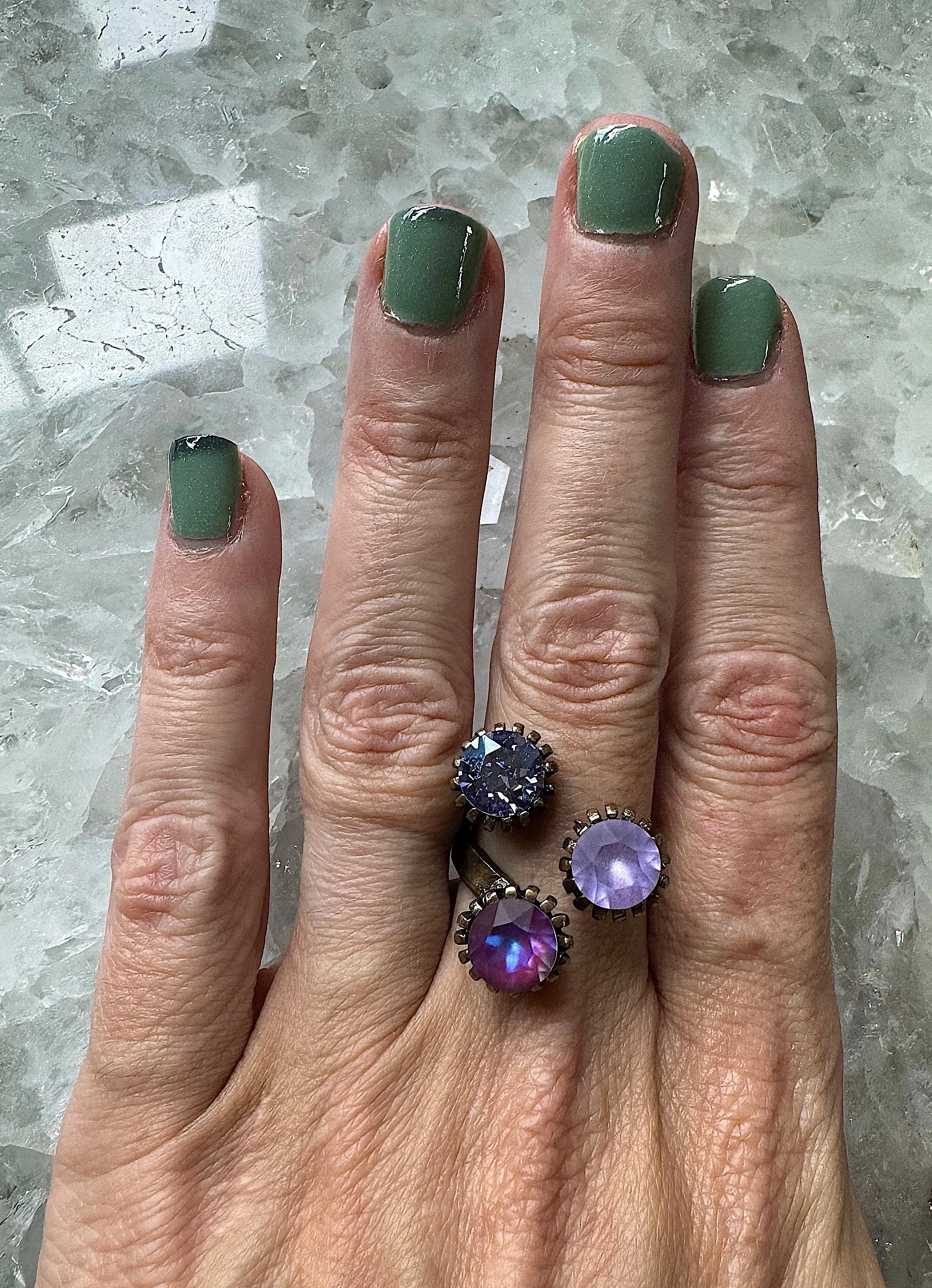 Triple Swarovski crystal medley, set on adjustable antiqued brass band, fitting all ring sizes
